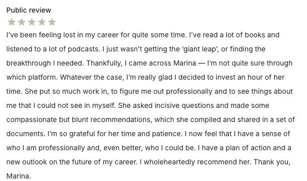 “Marina helped me understand why my work was respected but my influence was capped and how to change that without burning credibility.”