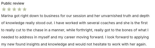 “I have worked with several coaches [before], and she is the first to really cut to the chase in a manner, while forthright, really got to the bones of what I needed to address in myself and my career moving forward. I look forward to applying my new found insights and knowledge…”